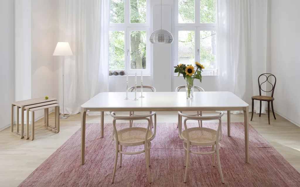 Through the use of wood, Thonet and James Irvine asked me to re-interpret the classic B9 tubular steel nested table set by Marcel Breuer.