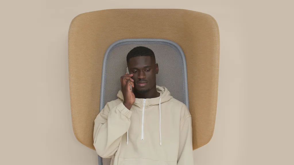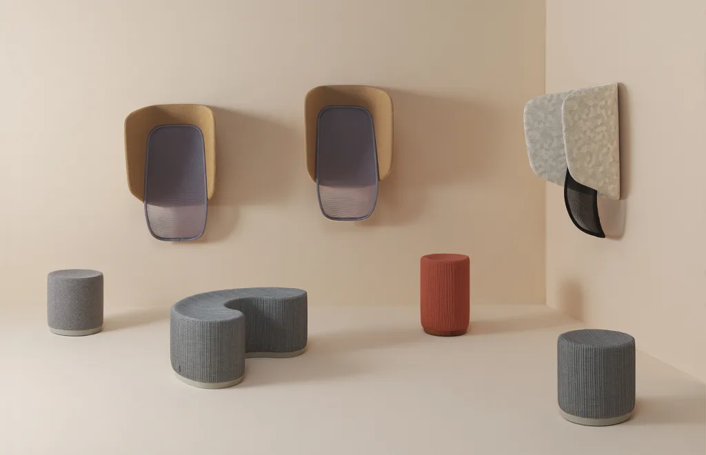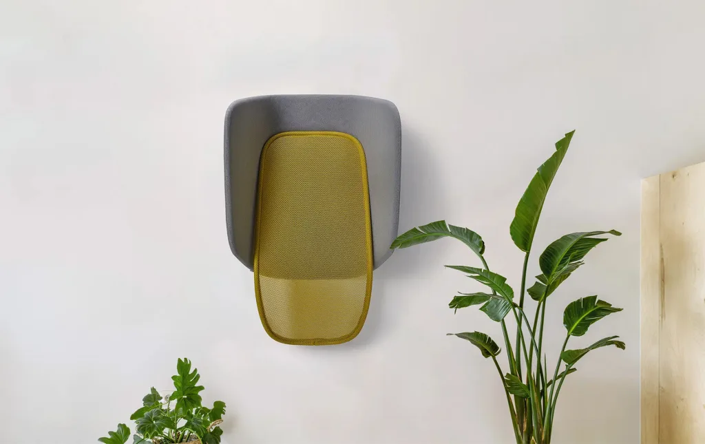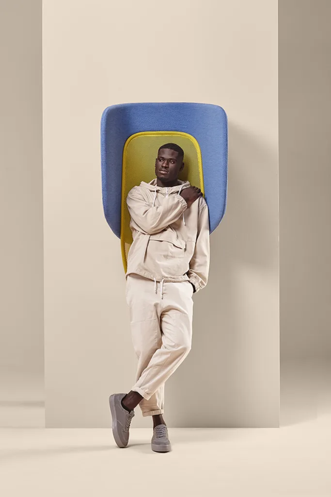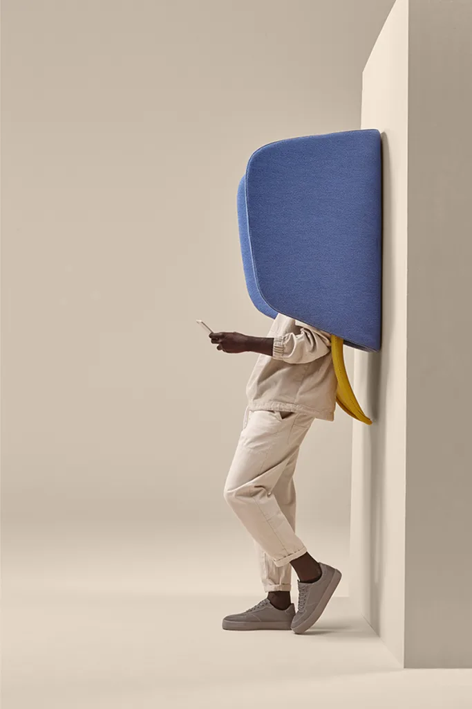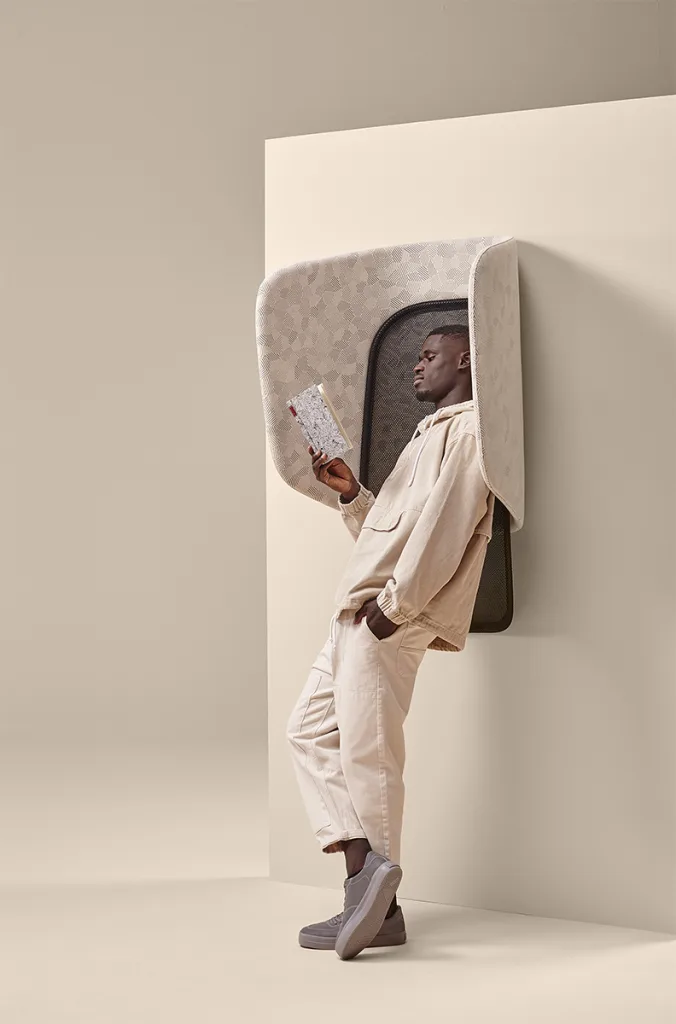 The integrated hood enhances acoustic comfort through softly curved upholstered panels, while its verticality introduces a new typology of comfort — ideal for short breaks in bustling spaces.