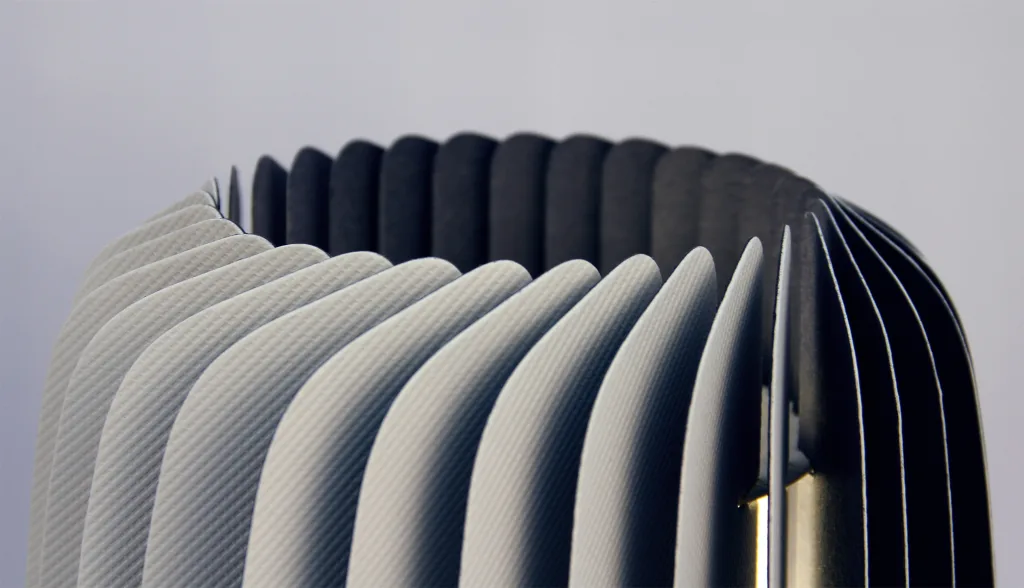 Composed of 30 paper fins assembled on a lighting base, it reminds the feathers of a bird.