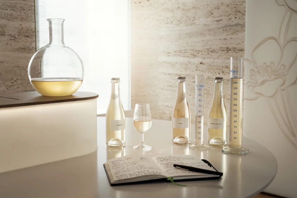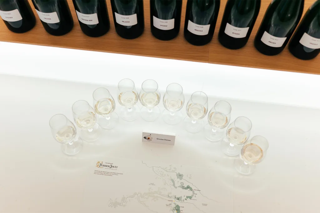 Conceived as a true experience, the tasting room extends the language of the wine through its architecture. Located in Épernay, within the historic buildings of Maison Perrier-Jouët, it provides an intimate setting dedicated to expertise and exchange. The Cellar Master welcomes wine experts to present the composition of the Champagnes, the blending process, and the philosophy behind each cuvée.