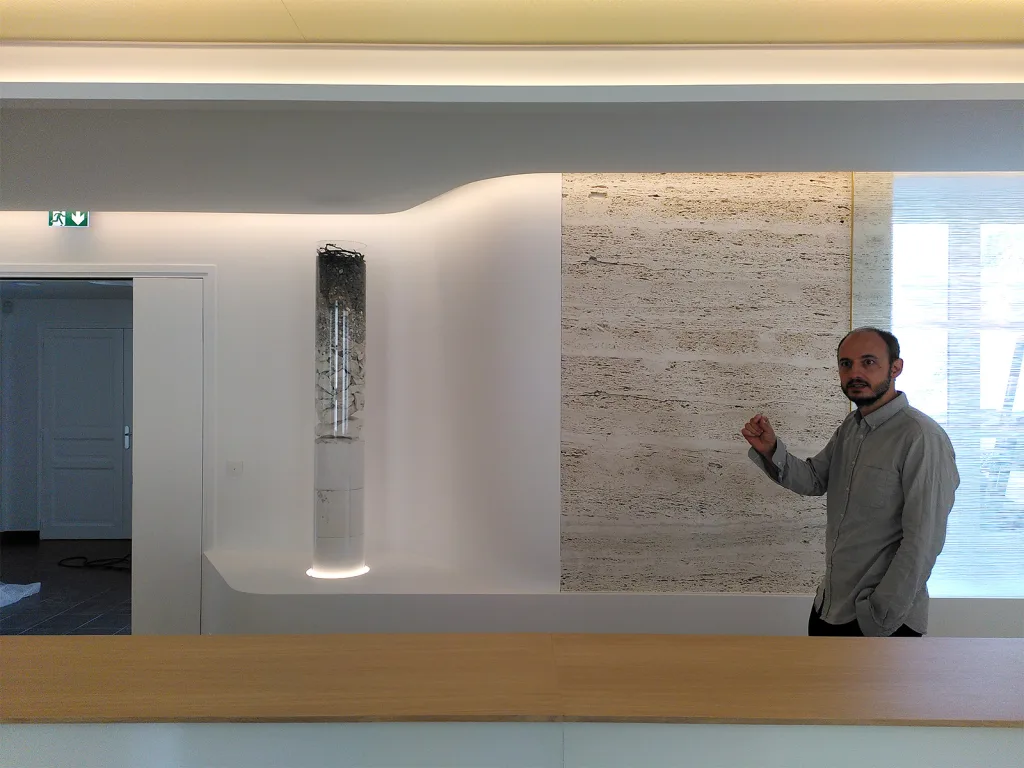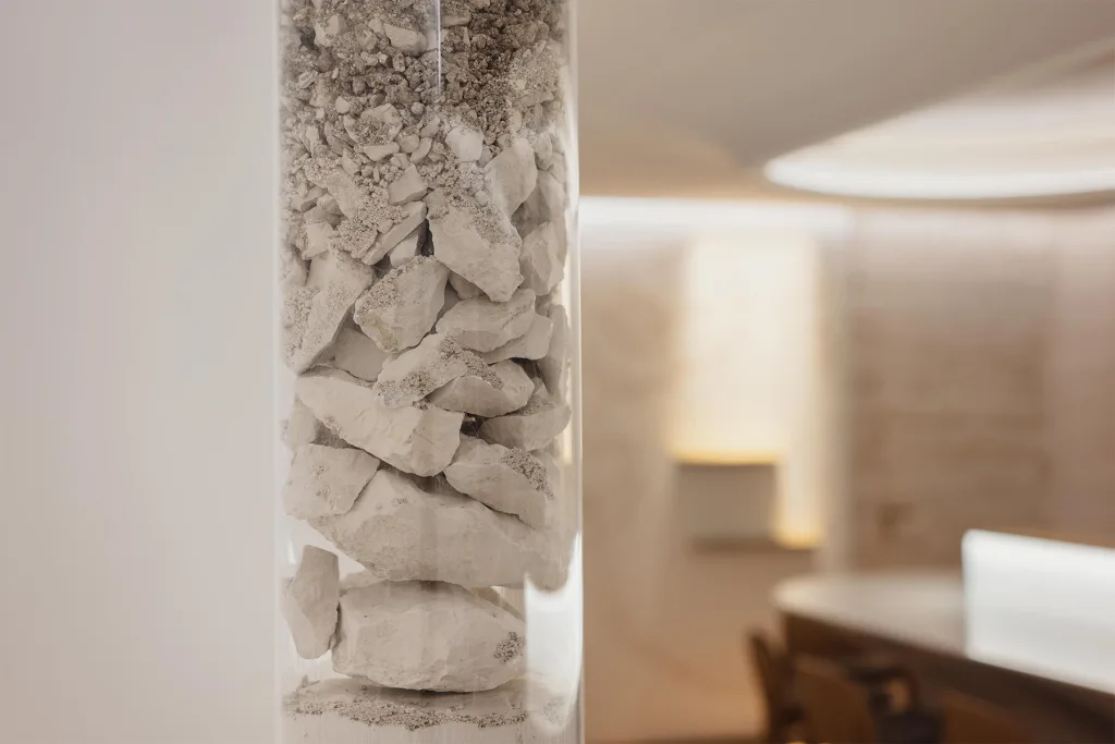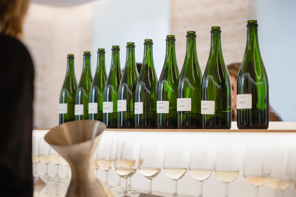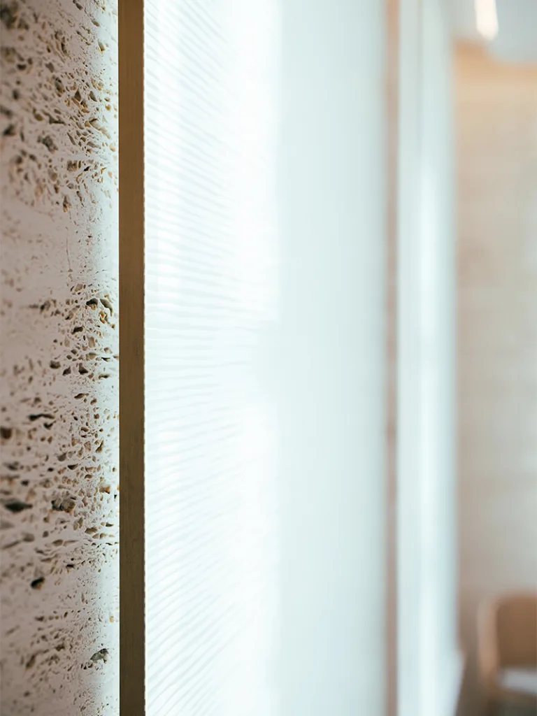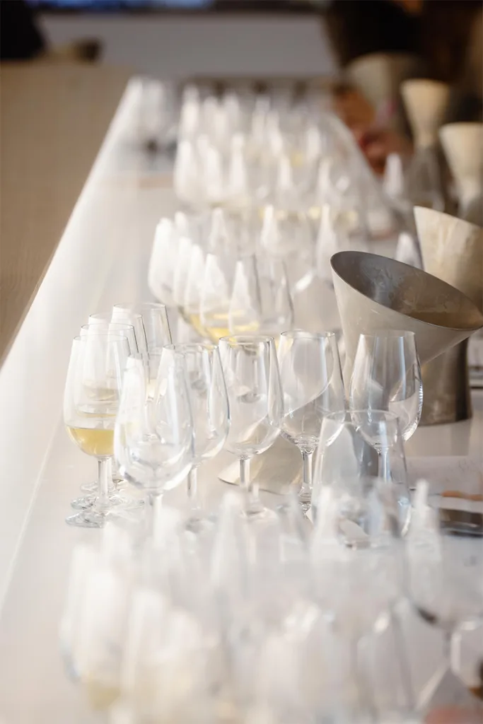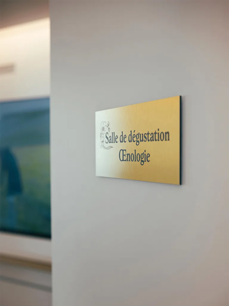 Travertine evokes the chalky vineyard soils, glass highlights the transparency of the wine, and touches of gold recall its luminous reflections. Particular attention was paid to the lighting, designed to faithfully reveal the colour of the wines while creating an atmosphere perfectly suited to tasting.