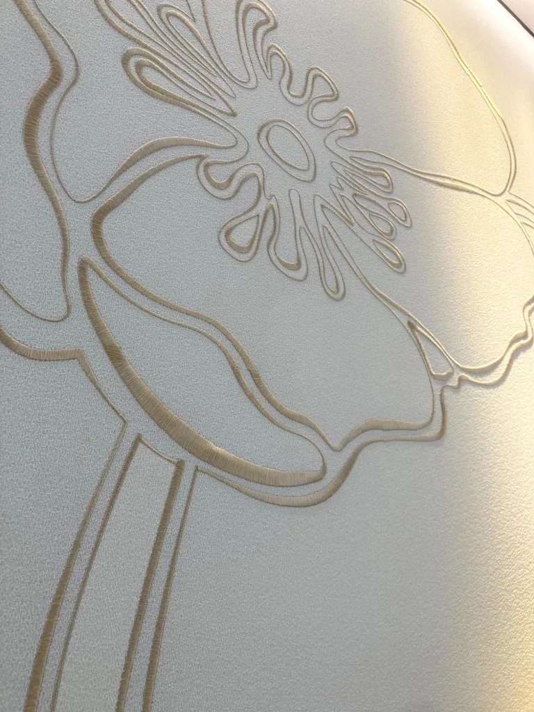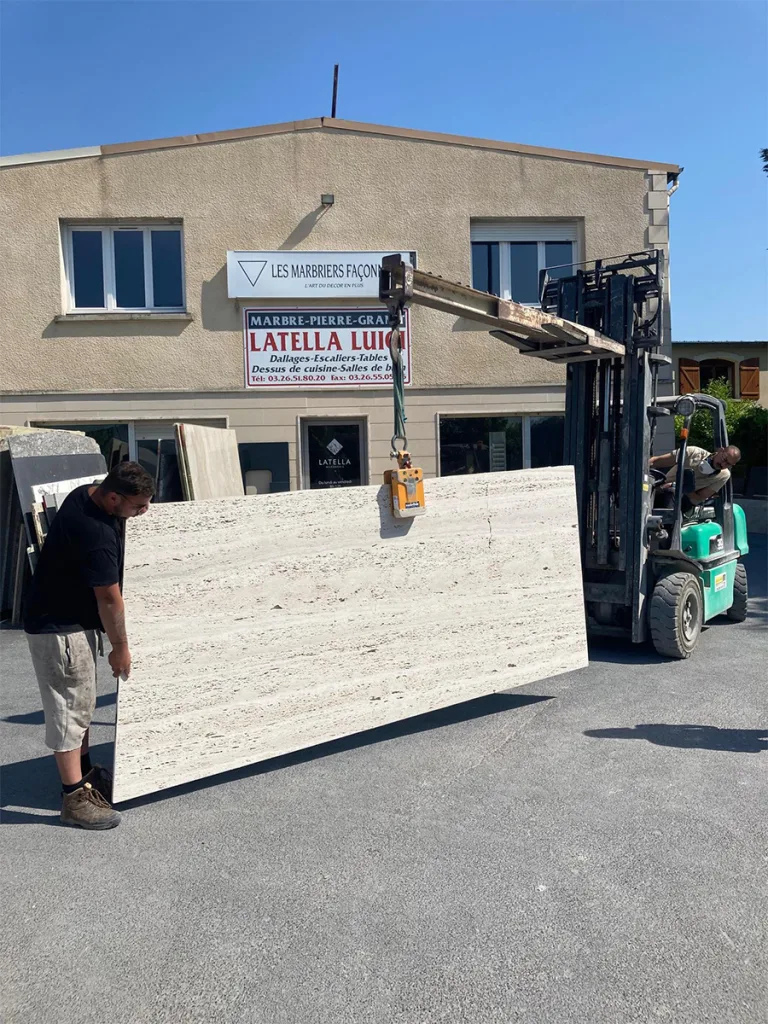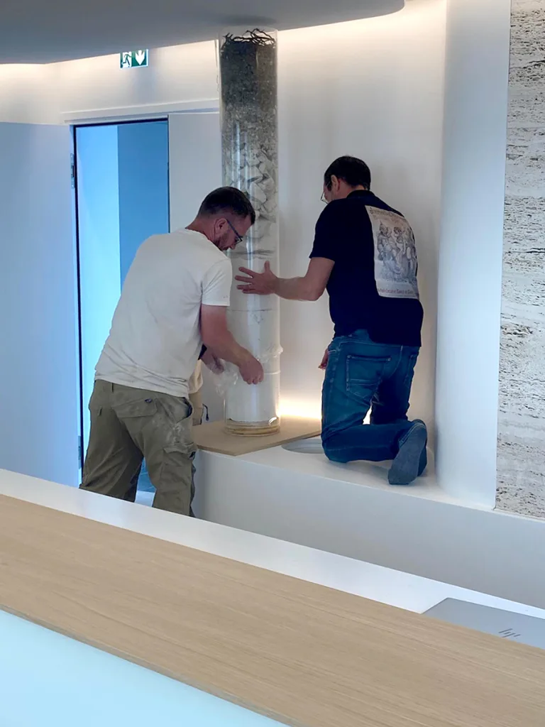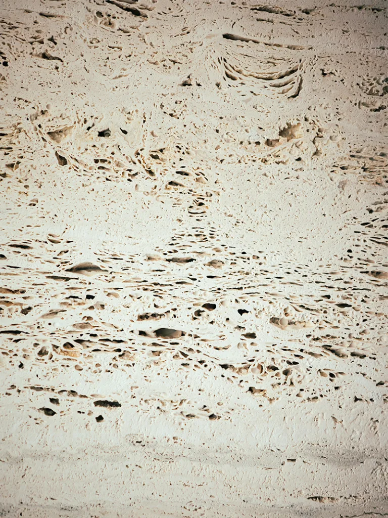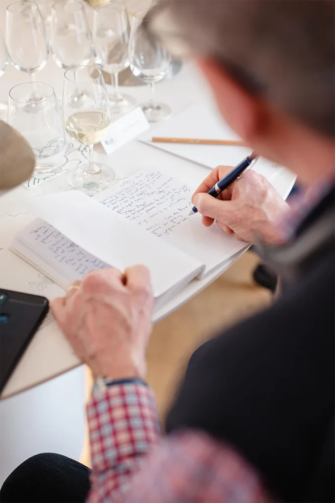 Travertine evokes the chalky vineyard soils, glass highlights the transparency of the wine, and touches of gold recall its luminous reflections. Particular attention was paid to the lighting, designed to faithfully reveal the colour of the wines while creating an atmosphere perfectly suited to tasting.