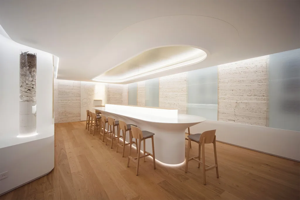 Travertine evokes the chalky vineyard soils, glass highlights the transparency of the wine, and touches of gold recall its luminous reflections. Particular attention was paid to the lighting, designed to faithfully reveal the colour of the wines while creating an atmosphere perfectly suited to tasting.